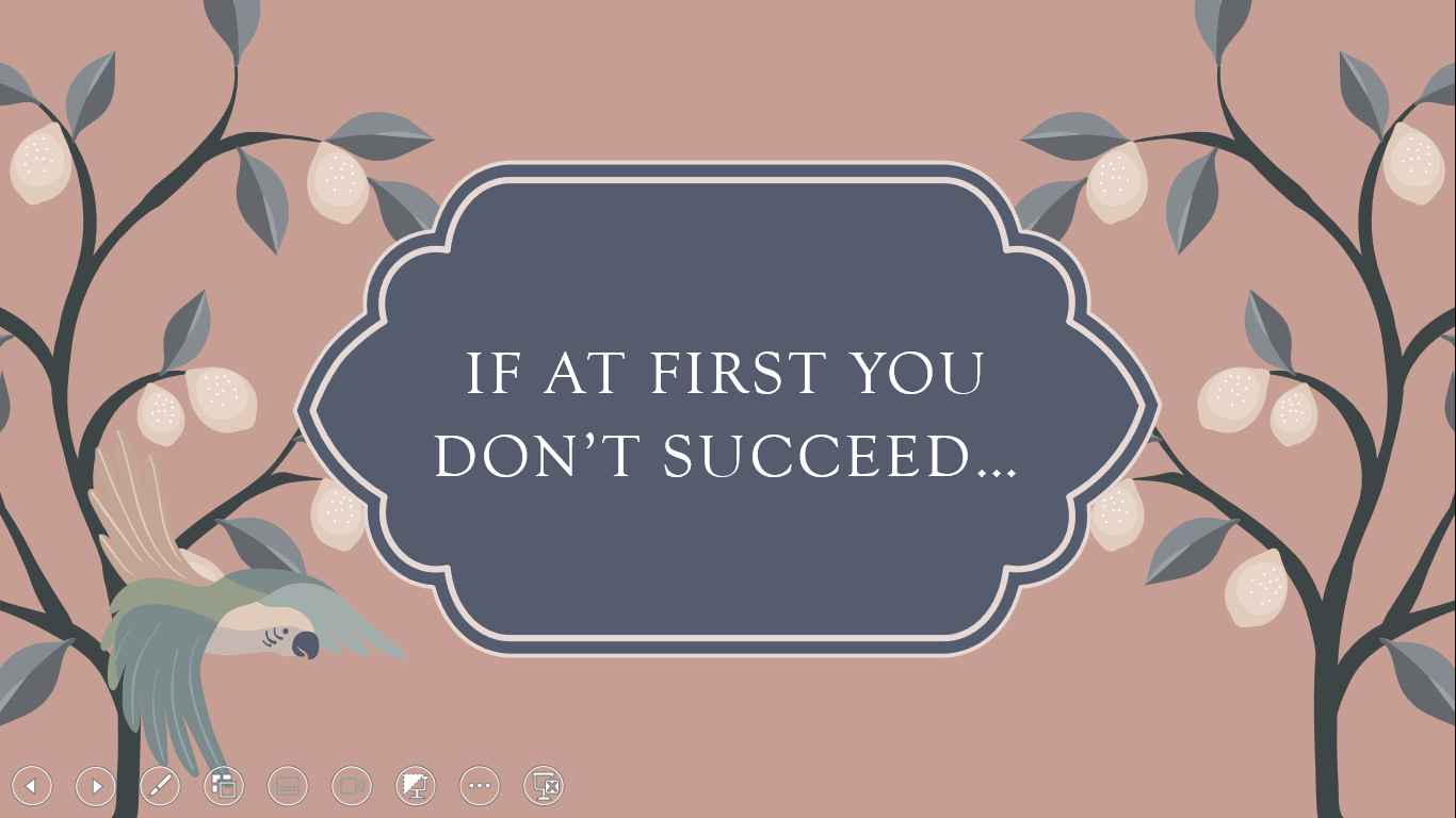 The first think I did was choose a PowerPoint theme with some interesting graphics and give my talk a title. I chose a presentation template called Pheasant and called it “If at first you don’t succeed.” I know what you’re thinking, PowerPoint is so passe, how can that engage? What a corny title, how will that grab kids’ attention? I didn’t know how. I just went with my gut–just like in the old days.